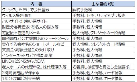 携帯電話の普及やパソコンを使う人が増えたことなどから、ショートメッセージ・LINE等の無料通信アプリ・SNSなどからのダイレクトメール等を利用した詐欺が激増しています。誰でも被害に遭いやすく、もしかしたらだまされている最中かもしれません。