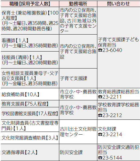 職種は表のとおりです。募集職種や採用予定人数などについては、変更となる場合がありますので、随時市ウェブサイトを確認してください。