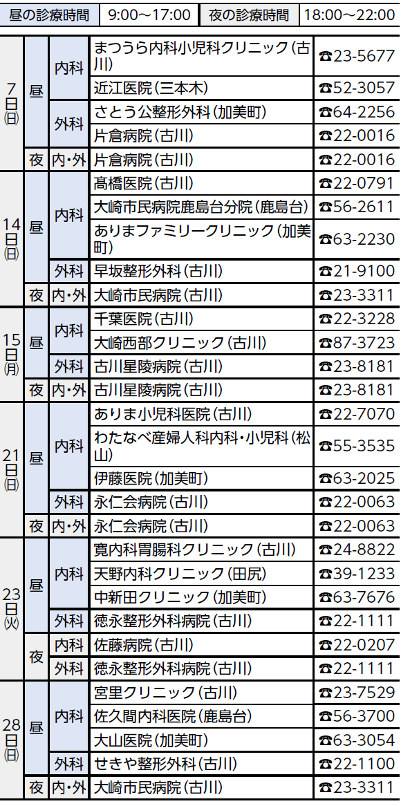 9月の休日救急当番医 大崎市医師会・加美郡医師会
