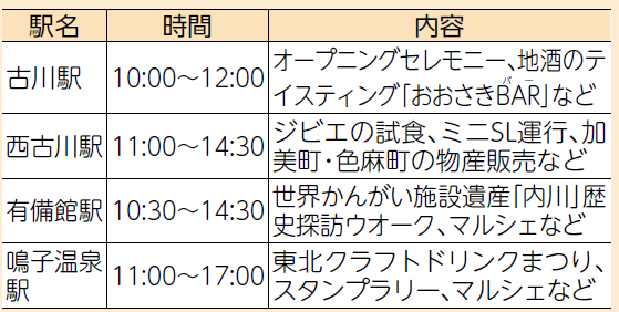 JR陸羽東線沿線の4つの駅で、子どもから大人まで楽しめるイベントを開催します。陸羽東線に乗って各駅を巡り、「おおさき魅力満喫ツアー」を楽しみませんか。