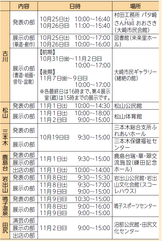 大崎市文化協会に加入する市内の団体などが、日頃の活動の成果を発表します。