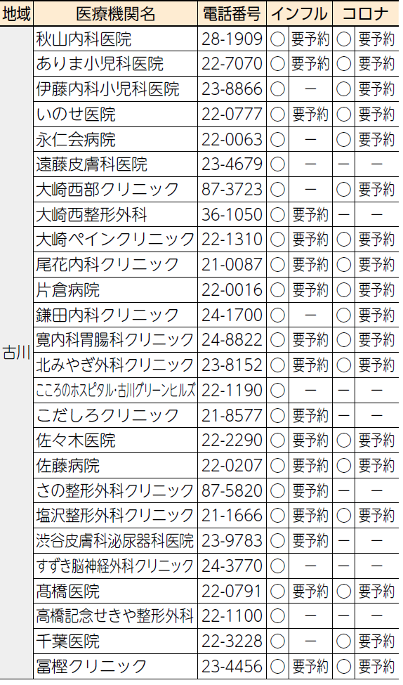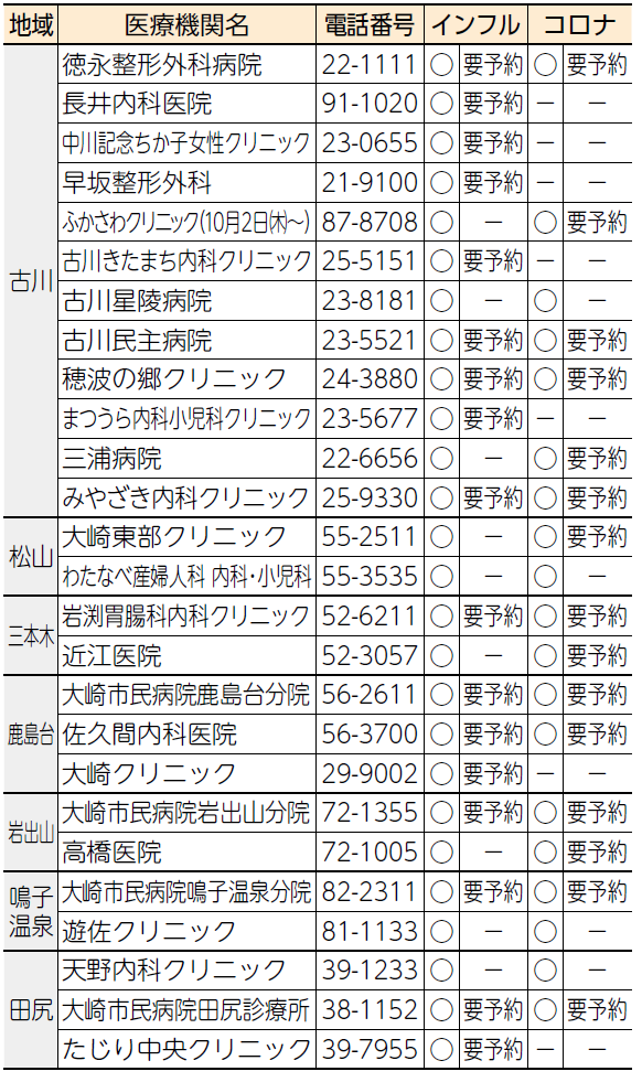 ▽予防接種指定医療機関 ※インフル…インフルエンザ、コロナ…新型コロナウイルス