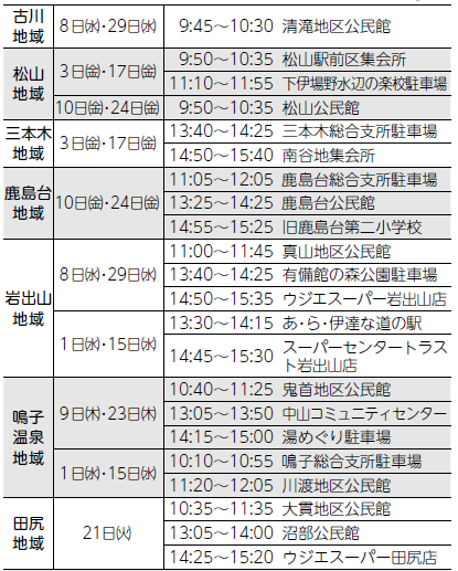くらし 10月の移動図書館 「きらり号」 21/28 前の記事 次の記事 発行日 : 2025年10月01日 自治体名 : 宮城県大崎市 広報紙名 : 広報おおさき 2025年10月号 ※悪天候などの事情で、運行を中止・変更する場合があります。 Tweet シェアする 大崎市乳幼児健診・相談予定表・母子イベント情報 市長コラム 天地人 豊穣(ほうじょう)の秋に思う