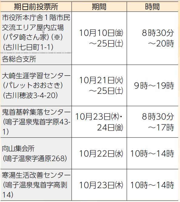 10月10日(金)から25日(土)まで、滞在先の市区町村で投票ができます。希望する場合は、大崎市選挙管理委員会に、投票用紙などの必要書類を早めに請求してください。