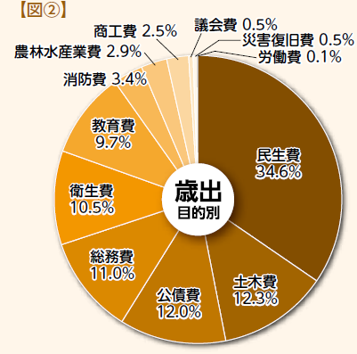 最も大きな割合を占めているのが民生費で、34.6%となりました。続いて土木費、公債費の順となっています。