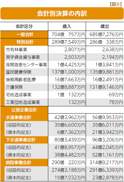 特別会計の総額(図(4))は、歳入は289億7549万円、歳出は286億338万円となり、形式収支は全ての会計で黒字となりました。