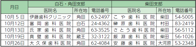 10月分の休日歯科診療の当番は下記のとおりです。