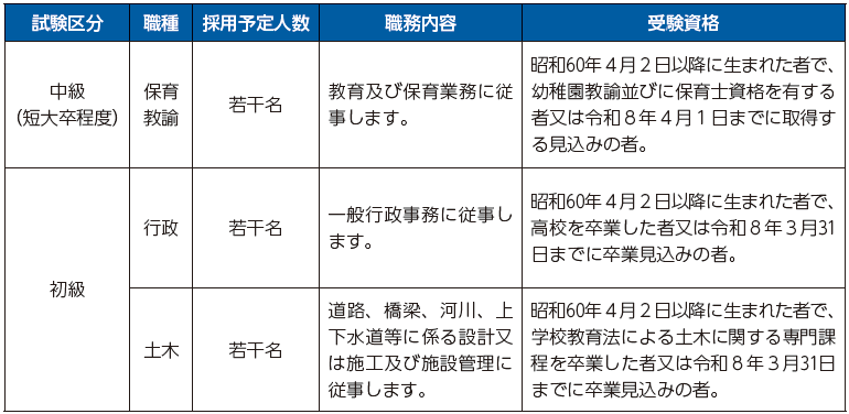 申し込み:申込書は役場総務課にあります。郵便で請求する場合は、封筒の表に「職員採用統一試験申込書請求」と朱書きし、宛先を明記のうえ、140円切手を貼った返信用封筒(A4サイズが入る大きさ)を必ず同封してください。