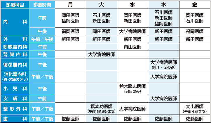 ・皮膚科は、都合により受付時間を短縮することもあります。当日電話等でご確認ください。