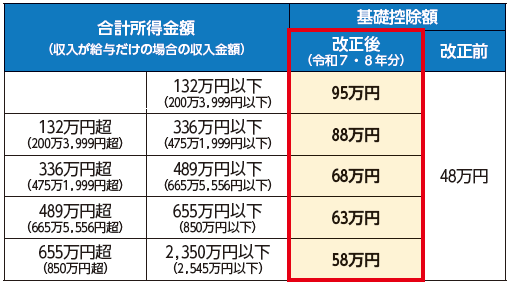 これまで一律48万円だった基礎控除が、最大95万円に変更され、所得に応じて右記のように変動します。