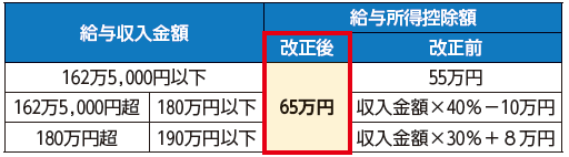 給与収入が190万円以下の方を対象に、控除額が最大55万円から65万円に引き上げられます。