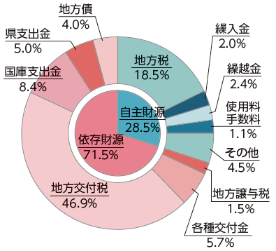 ・自主財源・依存財源…町税や施設使用料など、町が自らの収入とすることができる財源が「自主財源」。地方交付税、国庫・県支出金など、国や県から交付される財源や地方債(借金)が「依存財源」