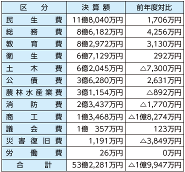 一方で、福祉センターの維持補修工事や役場駐車場の整備、災害復旧工事など臨時的な工事の費用が減少しました。また、制度改正により一時的に実施した下水道事業会計への繰出金が減少したことにより、使ったお金の総額も大きく減少しました。