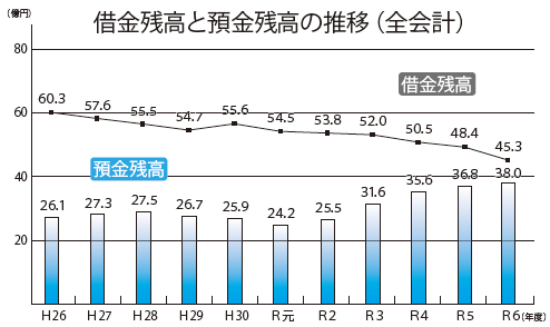 預金は、温泉事業会計において、老朽化した施設の補修のため、取り崩しましたが、そのほかの会計では増加(水道事業会計は増減なし)しており、町全体では1億2,000万円の増加となりました。