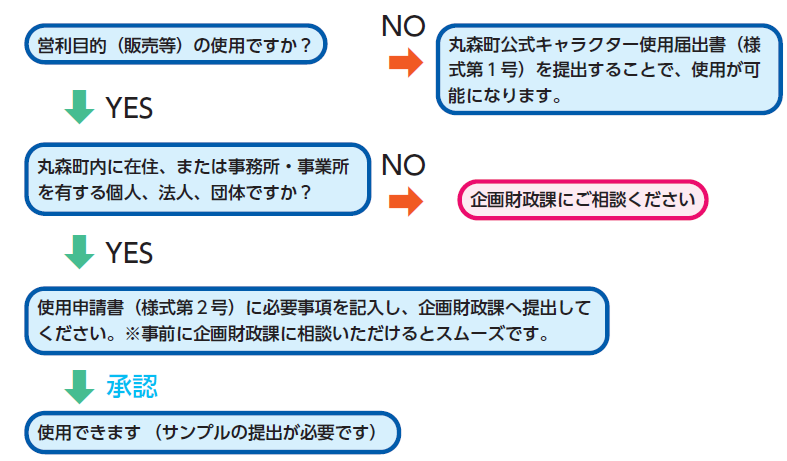 ▽丸森町公式キャラクター「ねこがみとうぐいすP」デザイン使用フローチャート