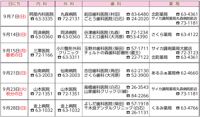 ※お子さんの夜間の急な発熱やけがの際は、下記にご相談ください。(毎日19:00~翌8:00)宮城県こども夜間安心コール【電話】♯8000(プッシュ回線、携帯電話)、【電話】022-212-9390(プッシュ回線以外、PHS)