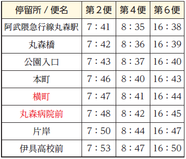 ・運行ルート変更にともない、停留所「横町」と「丸森病院前」の順路を入れ替え。