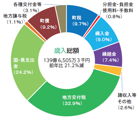 ▽歳入〔令和6年度一般会計歳入総額〕139億6,505万3千円(前年度比21.2%減)