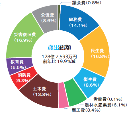▽歳出〔令和6年度一般会計歳出総額〕128億7,593万円(前年度比19.9%減)
