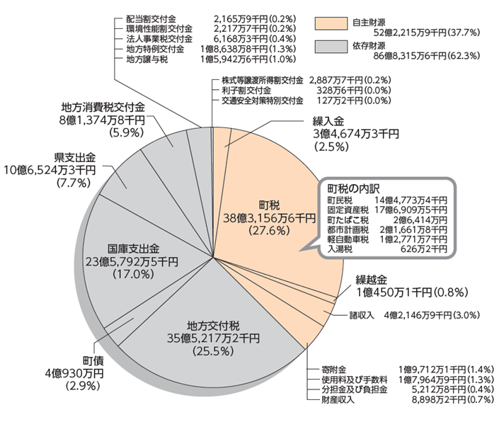 歳入全体の27・6%を占める町税は、固定資産税や軽自動車税は増加しているものの、定額減税の影響により個人住民税が大きく減少し、38億3,156万6千円(△2・5%)となりました。町単独で調達できる町税、使用料、繰入金などの自主財源は、町債(災害公営住宅建設事業債)の繰上償還に係る基金繰入金の減などにより52億2,215万9千円(△29・0%)となり、依存財源は、特別交付税が減となったものの、普通交付税が大きく増加したことなどが影響し、86億8,315万6千円(5・0%)となりました。