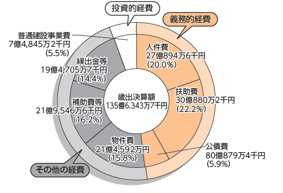 ・性質別分類… 地方公共団体の経費をその経済的性質を基準として分類したもので、歳出総額に占める義務的経費の割合が低く、建設事業費のような投資的経費の割合が高いほど行政構造は弾力性があり、健全な財政であるといえます。