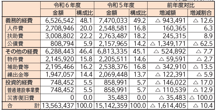 一般会計の決算額は、歳入139億531万5千円(対前年度比△11・0%)、歳出135億6,343万7千円(対前年度比△10・4%)となり、歳入歳出ともに前年度の決算額を下回りました。歳入歳出差引額(形式収支)は、3億4,187万8千円となり、このうち一部事業の繰越により、令和7年度に繰越すべき財源が3,601万5千円あることから、実質的な残額(実質収支)は3億586万3千円の黒字決算となりました。