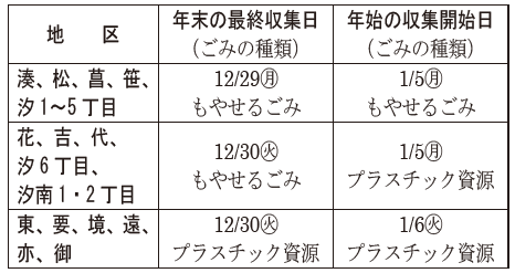 年末年始のごみ収集は表のとおりです。休み中はごみを出さないでください。また、年始には大量のごみが予想されますが、ごみの減量・分別の徹底にご協力をお願いします。