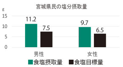 宮城県民は塩分をとりすぎているのを知っていますか?塩分の目標量は男性7.5g未満・女性6.5g未満に対し、宮城県民は男性で4g・女性で3gも多く取りすぎている現状があります。