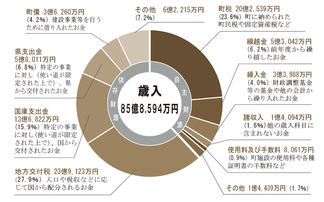 32億6,163万円(38.0%)町税や施設使用料など、町が自主的に収入とすることができるお金