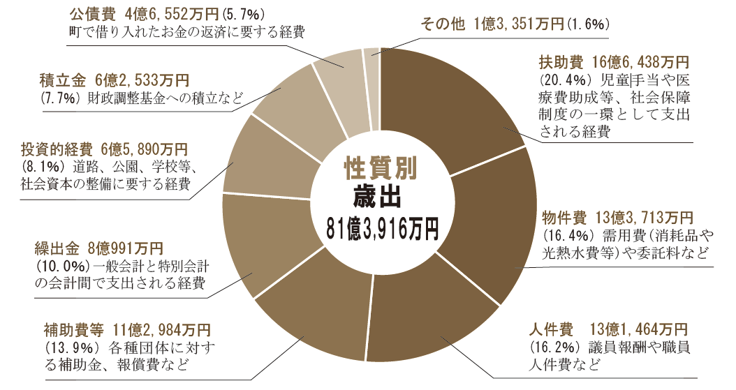 歳出決算額は、81億3,916万円となり、前年度より3,007万円増加しました。アクアリーナ機械設備改修工事の前払金などにより増加したものです。