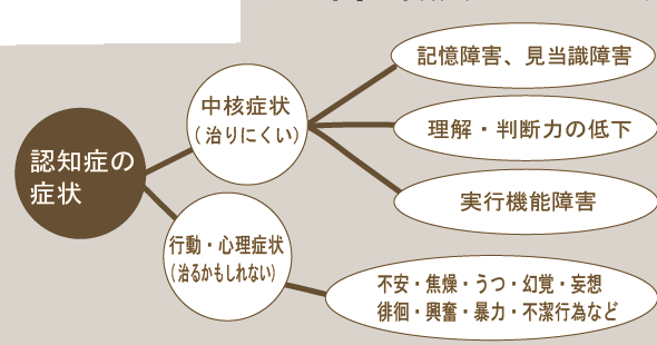 記憶障害(忘れてしまう)や見当識障害(日付や時間、場所が分からなくなる)、理解力の低下は、中核症状といって治りにくい症状ですが、暴力や徘徊、幻覚のような症状は、行動・心理症状といって対応を工夫することで、現れにくくしたり症状を軽くすることができます。