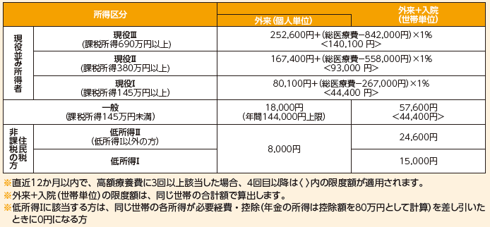 国民健康保険および後期高齢者医療制度へ加入中の方は、医療機関でのひと月当たり(1日~31日まで)の自己負担額が以下の表までと決められています。