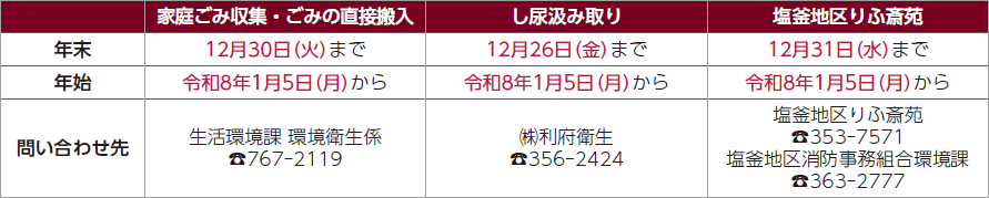 くらし ごみ収集・し尿汲み取り・斎場の年末年始営業日について 8/41 前の記事 次の記事 発行日 : 2025年11月26日 自治体名 : 宮城県利府町 広報紙名 : 広報りふ 令和7年12月号 ※し尿汲み取りの受付は12月19日(金)まで。 ※ごみの直接搬入の際は、役場での事前申請が必要です。年内開庁日は12月26日(金)までとなりますのでご注意ください。 Tweet シェアする まちからのお知らせ(2) クマの出没に注意してください