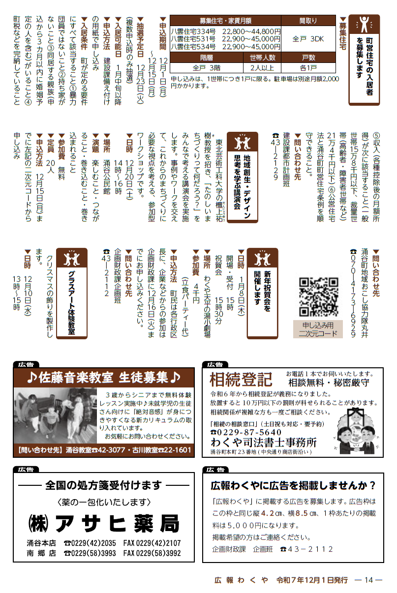くらし 広報わくや 令和7年12月号 P.14 14/24 前の記事 次の記事 発行日 : 2025年12月01日 自治体名 : 宮城県涌谷町 広報紙名 : 広報わくや 令和7年12月号 Tweet シェアする 広報わくや 令和7年12月号 P.13 広報わくや 令和7年12月号 P.15