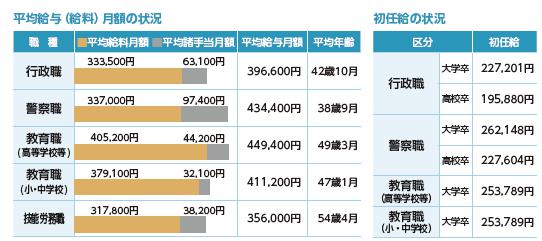 県職員の給与は、生計費や民間企業の賃金、国や他の地方公共団体の職員との均衡を考慮した上で、条例により定められています。職種別の平均給与月額などの現状は、次のとおりです。