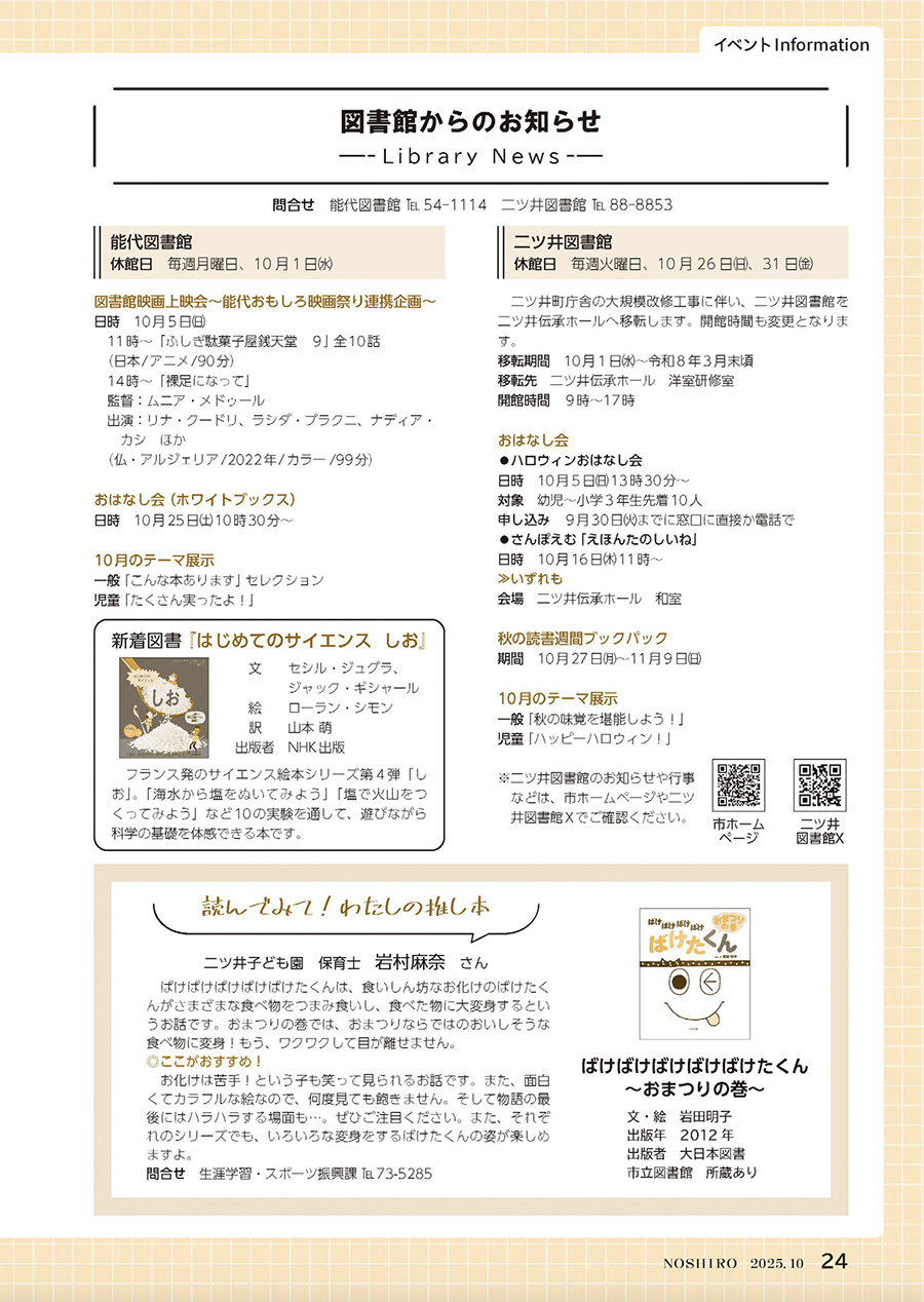 くらし 広報のしろ 令和7年10月号P.24 19/25 前の記事 次の記事 発行日 : 2025年09月25日 自治体名 : 秋田県能代市 広報紙名 : 広報のしろ 令和7年10月号 Tweet シェアする 広報のしろ 令和7年10月号P.23 広報のしろ 令和7年10月号P.25