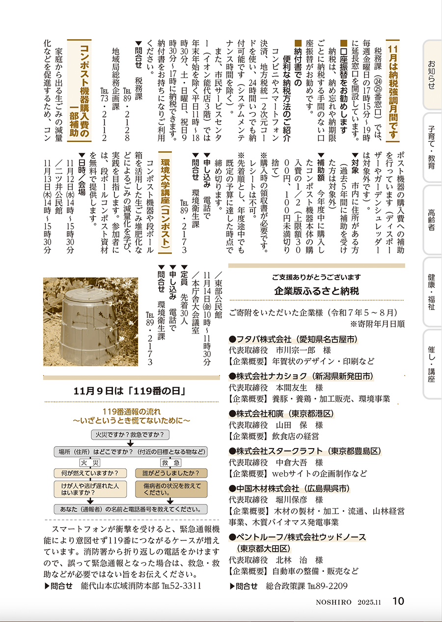 くらし 広報のしろ 令和7年11月号P.10 8/25 前の記事 次の記事 発行日 : 2025年10月25日 自治体名 : 秋田県能代市 広報紙名 : 広報のしろ 令和7年11月号 Tweet シェアする 広報のしろ 令和7年11月号P.9 広報のしろ 令和7年11月号P.11