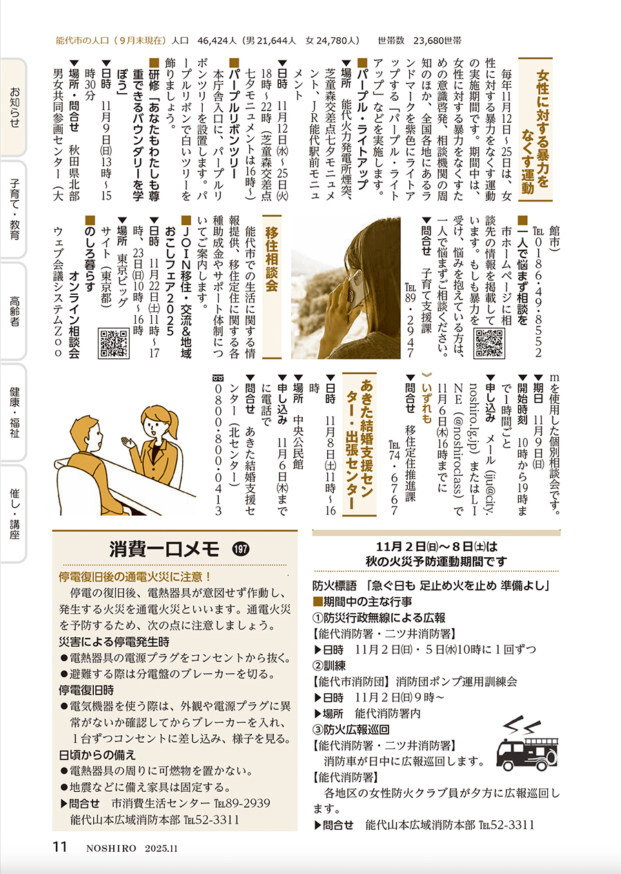 くらし 広報のしろ 令和7年11月号P.11 9/25 前の記事 次の記事 発行日 : 2025年10月25日 自治体名 : 秋田県能代市 広報紙名 : 広報のしろ 令和7年11月号 Tweet シェアする 広報のしろ 令和7年11月号P.10 広報のしろ 令和7年11月号P.12