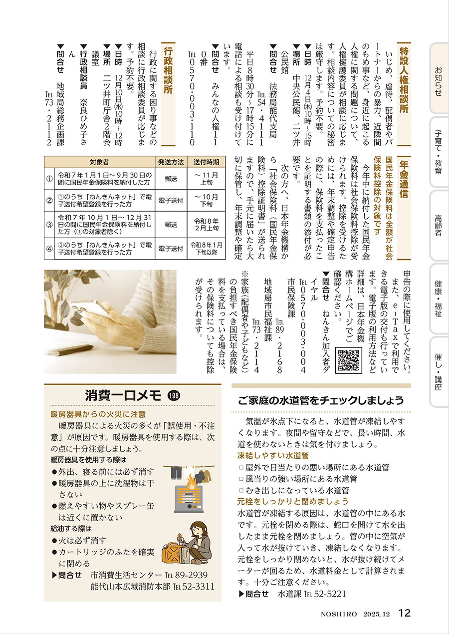 くらし 広報のしろ 令和7年12月号P.12 9/27 前の記事 次の記事 発行日 : 2025年11月25日 自治体名 : 秋田県能代市 広報紙名 : 広報のしろ 令和7年12月号 Tweet シェアする 広報のしろ 令和7年12月号P.11 広報のしろ 令和7年12月号P.13