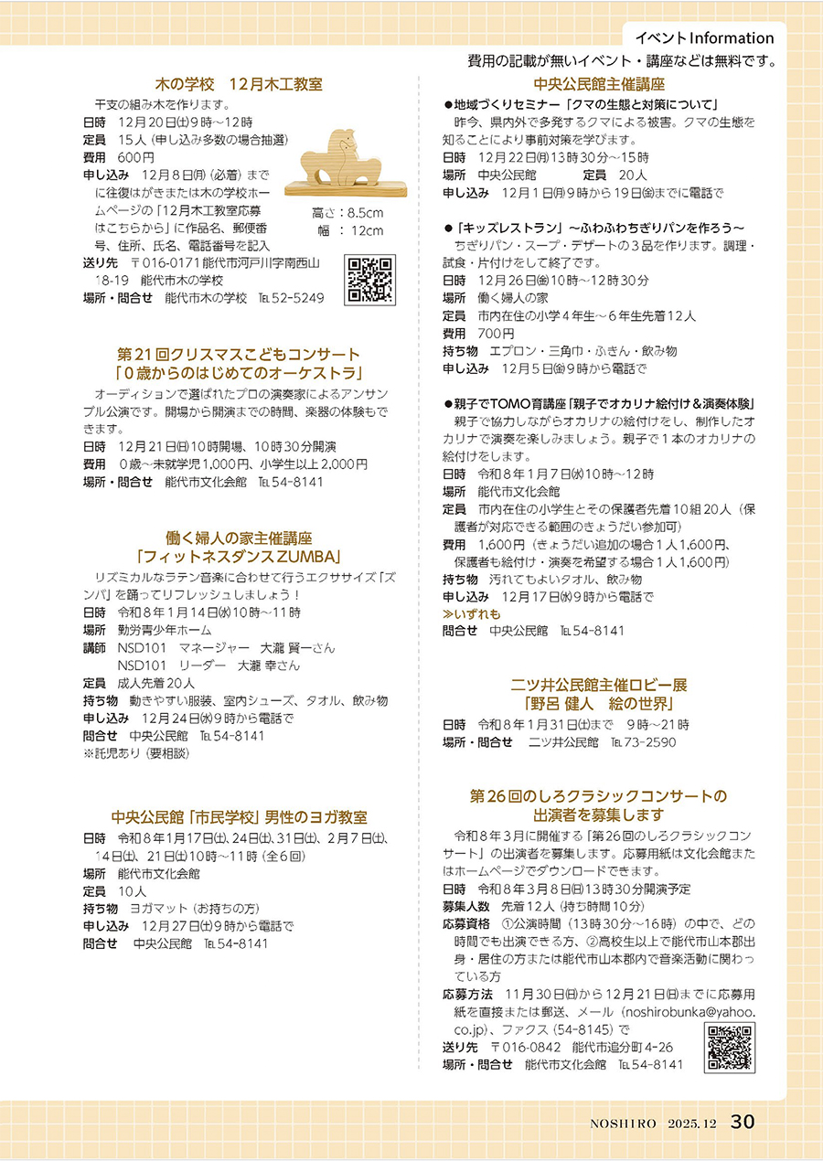 講座 広報のしろ 令和7年12月号P.30 23/27 前の記事 次の記事 発行日 : 2025年11月25日 自治体名 : 秋田県能代市 広報紙名 : 広報のしろ 令和7年12月号 Tweet シェアする 広報のしろ 令和7年12月号P.29 広報のしろ 令和7年12月号P.31