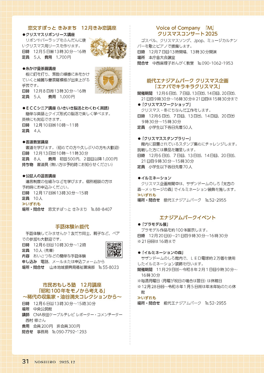 講座 広報のしろ 令和7年12月号P.31 24/27 前の記事 次の記事 発行日 : 2025年11月25日 自治体名 : 秋田県能代市 広報紙名 : 広報のしろ 令和7年12月号 Tweet シェアする 広報のしろ 令和7年12月号P.30 広報のしろ 令和7年12月号P.32-P.33