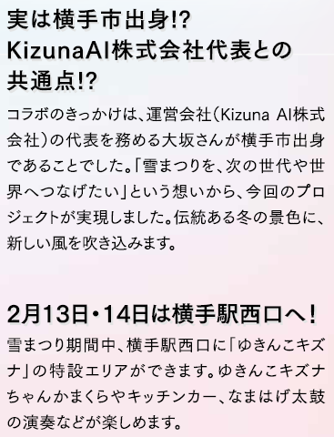 イベント 横手の雪まつりとキズナの初コラボ 4/41 前の記事 次の記事 発行日 : 2026年02月01日 自治体名 : 秋田県横手市 広報紙名 : 市報よこて 令和8年2月号 Tweet シェアする 今月の読者プレゼントクイズandおたよりご紹介 横手の雪まつり情報