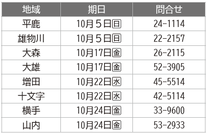 日時:下記の通り。実施会場と時間の詳細は各市民サービス課(横手地域は健康推進課)に問い合わせいただくか、市ホームページでご確認ください