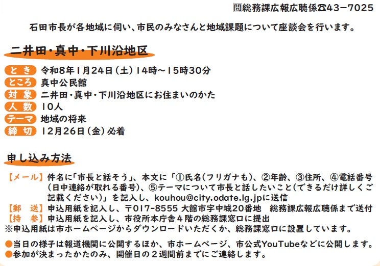 くらし 市長と話そう~石田市長が地域課題をお聞きします~開催! 20/27 前の記事 次の記事 発行日 : 2025年12月05日 自治体名 : 秋田県大館市 広報紙名 : 広報おおだて 令和7年12月号 Tweet シェアする みんなの掲示板―お知らせ はちくんの本棚(ほんだな)