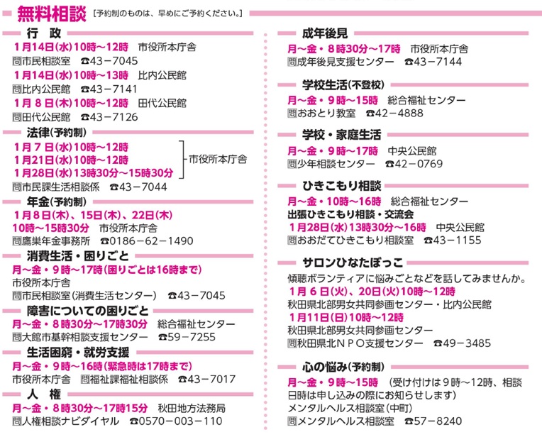 くらし 無料相談 20/22 前の記事 次の記事 発行日 : 2026年01月05日 自治体名 : 秋田県大館市 広報紙名 : 広報おおだて 令和8年1月号 Tweet シェアする 生活ガイド 今月の納期限・口座振替日