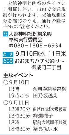 イベント 大館神明社例祭に伴う交通規制にご協力ください 20/28 前の記事 次の記事 発行日 : 2025年09月05日 自治体名 : 秋田県大館市 広報紙名 : 広報おおだて 令和7年9月号 ※詳しくは本紙をご覧ください。 Tweet シェアする みんなの掲示板―お知らせ クマに注意!