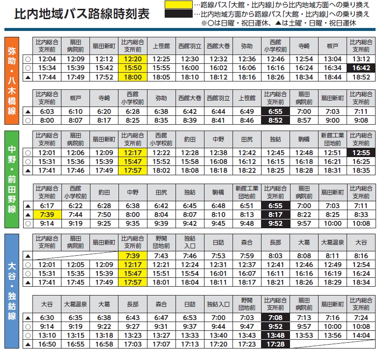 ・バス停以外で乗り降りできるフリーバス区間を拡充します。弥助・八木橋線は比内総合支所から板戸までを除いた区間、中田野線と大谷・独鈷線は比内総合支所から独鈷大日堂入口までを除いた区間が対象となります。