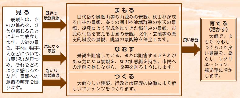 先人が守り育ててきた大館の景観を、一人一人の視点で「見る」ことから始め、その景観をまもり、なおし、つくることにより、大館の景観を未来へ引き継ぎます