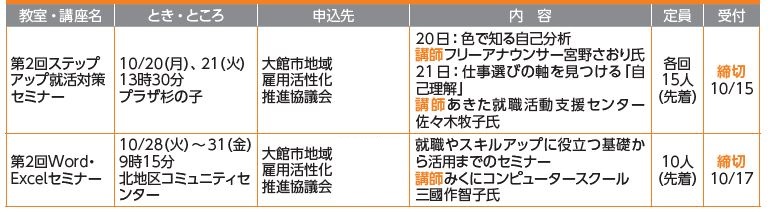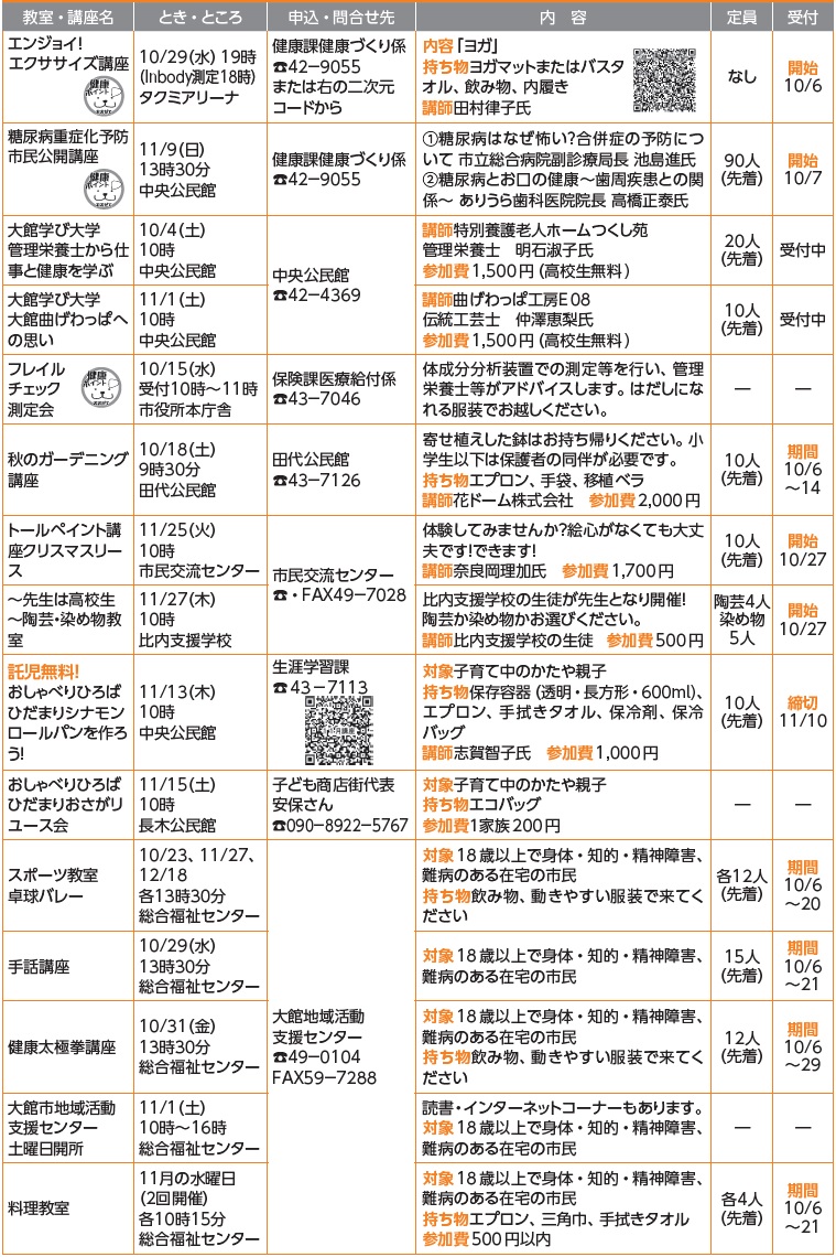 講座 市の教室・講座 21/33 前の記事 次の記事 発行日 : 2025年10月05日 自治体名 : 秋田県大館市 広報紙名 : 広報おおだて 令和7年10月号 ・受付の表記 開始:受付開始日 締切:受付締切日 期間:受付期間 Tweet シェアする 屋外体育施設を冬期間閉鎖します みんなの掲示板―イベント