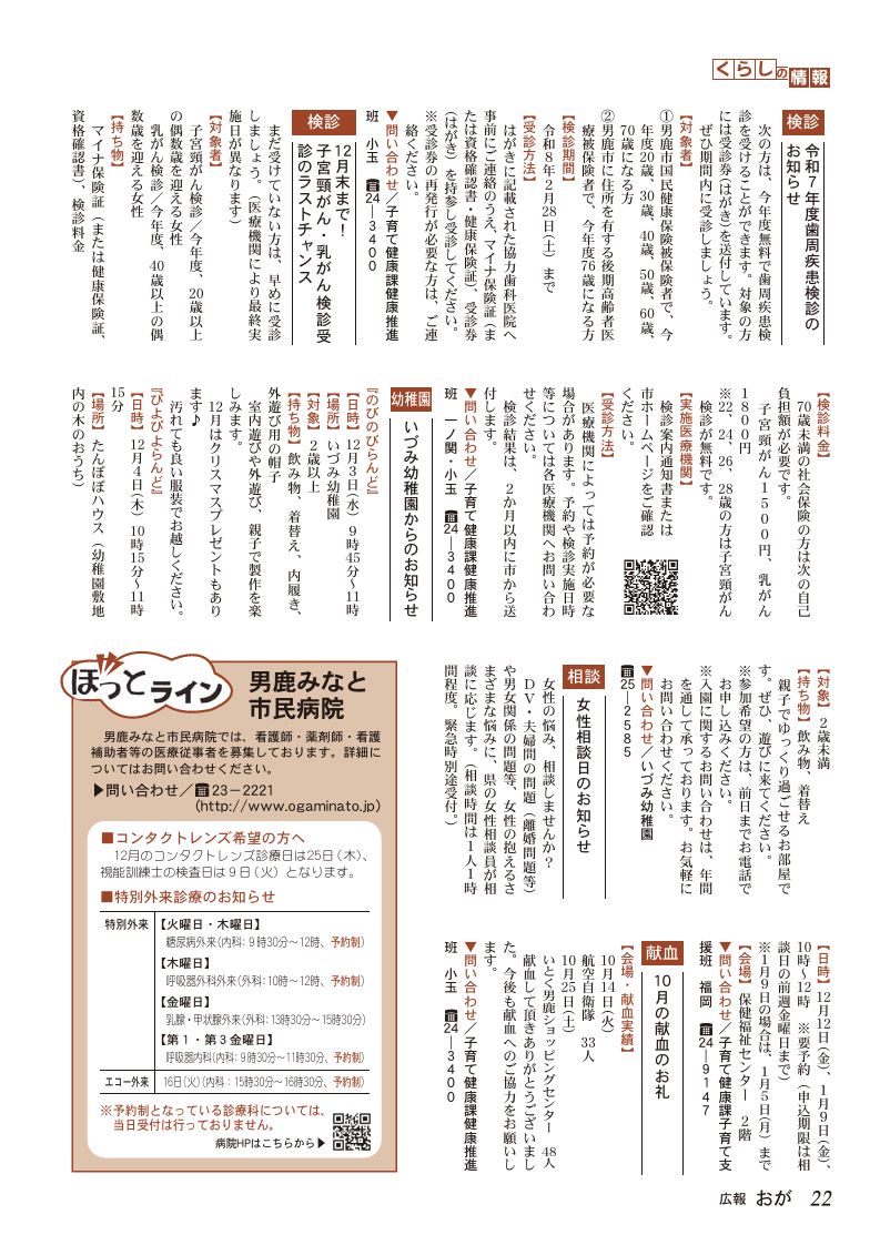 くらし 広報おが(2025年12月号) P.22 22/32 前の記事 次の記事 発行日 : 2025年12月01日 自治体名 : 秋田県男鹿市 広報紙名 : 広報おが (2025年12月号) Tweet シェアする 広報おが(2025年12月号) P.21 広報おが(2025年12月号) P.23